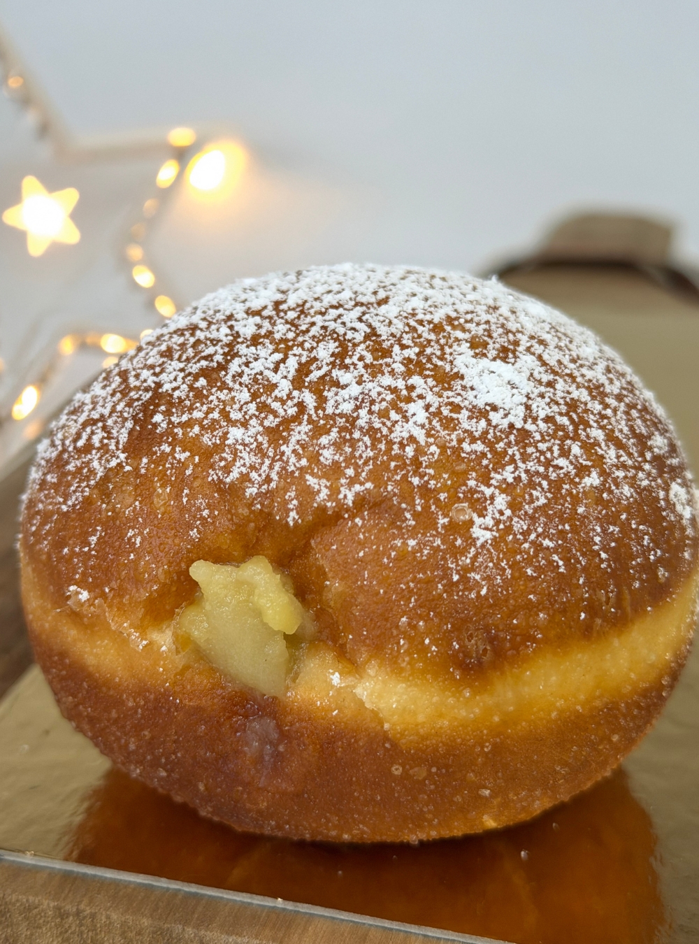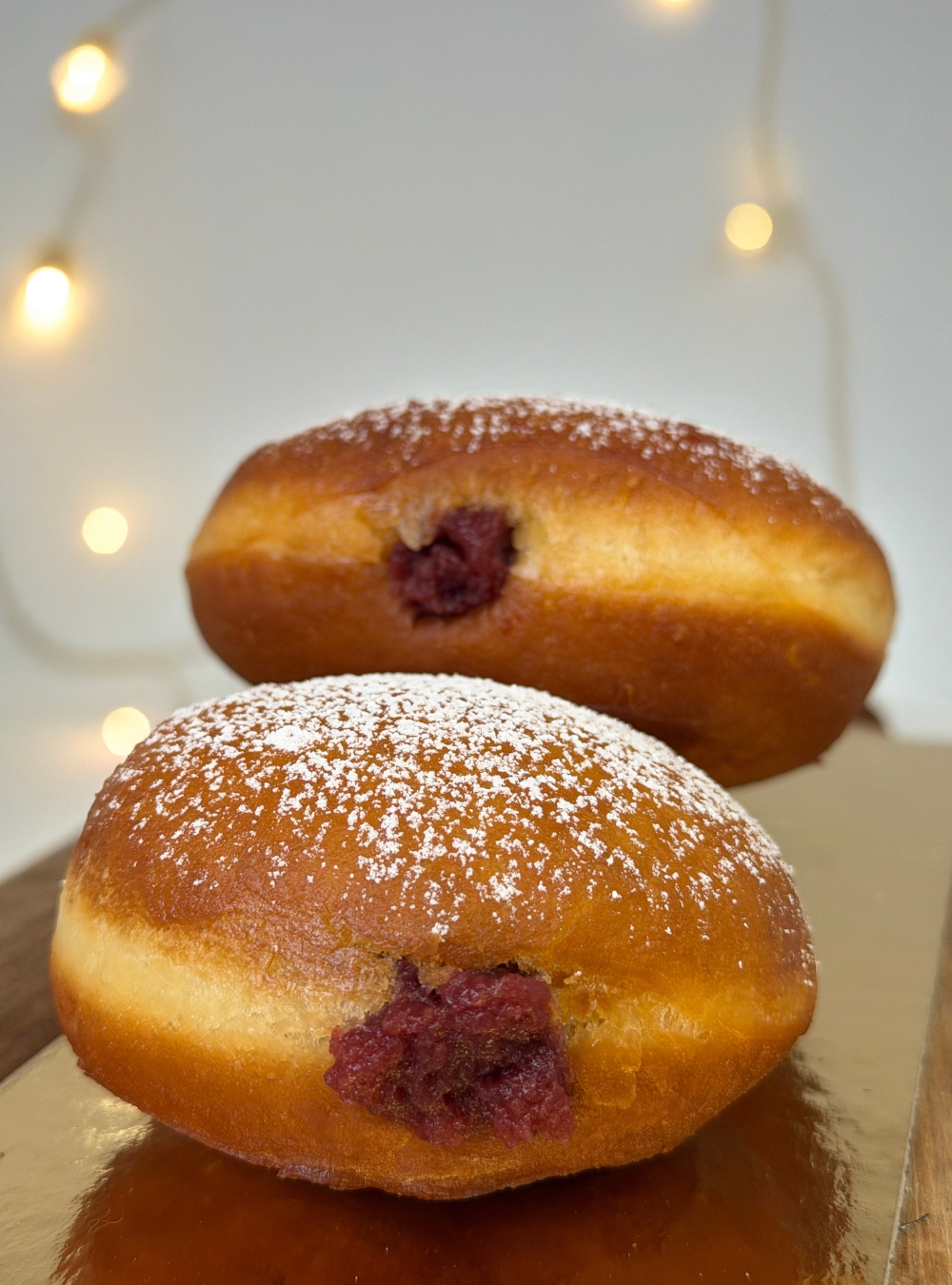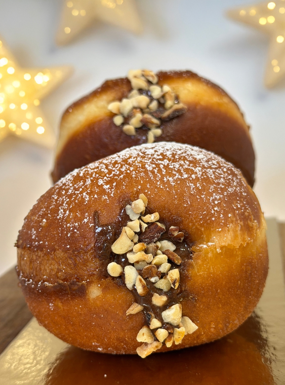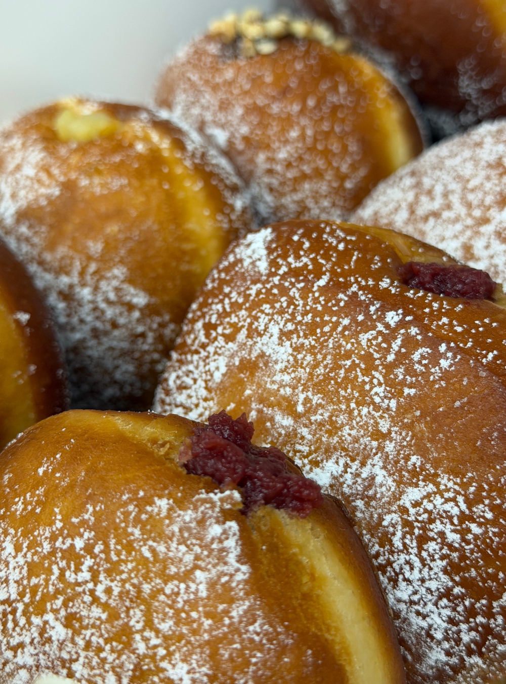 Un beignet de Hanouka moelleux et délicatement doré, garni au choix, Framboise fruitée, Pâte à tartiner maison, Compote de pomme parfumée à vanille ou nature sucrée pour les amateurs de classique. Chaque bouchée offre un pur moment de douceur et de gourmandise.